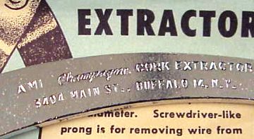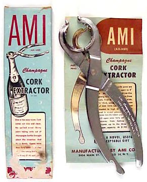 Buffalo, New York - From 1950 to 1967 Joseph Amigone received four patents for a "Gripper-Type Cork Extractor." The first was utility patent 2,495,308 issued January 24, 1950. The other three were design patents. Amigone's primary objective was to get a firm grip on a Champagne cork and remove it "without destruction or mutilation of the body to preserve the period of subsequent usefulness."