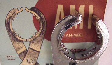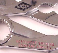 The Ami "open-all" was also offered with a cowhide holster with hanging ring for keeping it handy at the bar. Literature suggested "As a gift, as a prize, Ami is appreciated by everybody. And the fact that it can be furnished with engraved names, signatures and initials, or embossed emblems of most fraternal orders, societies, colleges and military services, make it appropriate of numerous occasions." The two grippers above left were used as such. One has the Dana Corporation logo and the other is engraved "Northwest Brewing Company Limited."