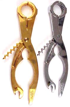 The cork gripper combination tool can be found in several different packages with a variety of instructions. The "Everything Tool" box contained the Japanese version of the tool without corkscrew. It was produced in Japan for Chadwick-Miller Company, Boston and the package has a copyright date of 1969. It was billed as "The tool of a hundred uses" including "... Nut, Shell-fish and Ice Cracker, Jar Opener, Wrench, Tong, Bottle Opener, Hammer, Screwdriver, Cork Remover and Lemon Squeezer."