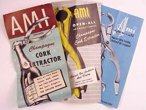 This early package claims "with one or two easy twists, the most stubborn of Champagne bottle corks yields ... nice and clean! ... without spilling any of the Champagne ... and without getting anyone mad or hurt!" In addition it "will open more than 40 other food closures."