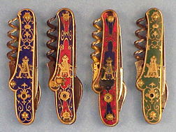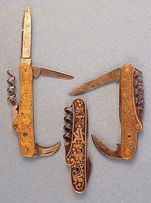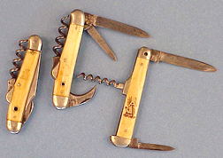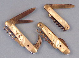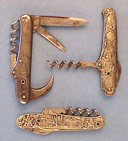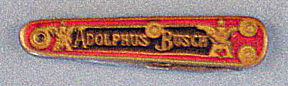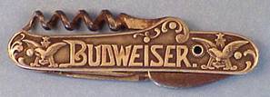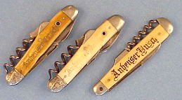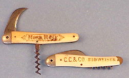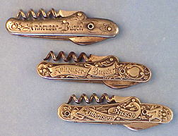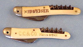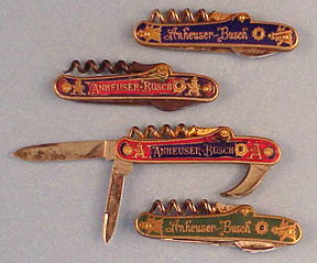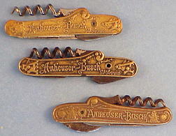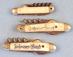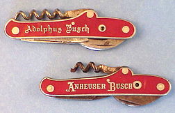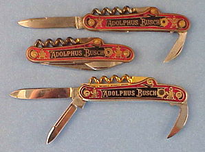 Knives of all sorts have been a popular means of advertising for well over one hundred years. The better the quality, the more likely the knife will be kept handy by the owner. The advertising message will be read time and time again. The corkscrew knives most sought after are the Anheuser-Busch champagne pattern pocket knives. Over 65 varieties of these were produced in the late 1800s and early 1900s to be given away by Adolphus Busch during his world travels. Lest he not be forgotten, a photo of him was included in a peephole or Stanhope lens mounted in the knife. Some had a second peephole picturing the brewery.