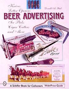 Beer Advertising:Knives, Letter Openers, Ice Picks, Cigar Cutters,and More - This book gets right to the point. In over 500 photographs Donald Bull looks at the many types of beer advertising objects which are pointed or sharp. Knives, letter openers, and ice picks readily come to mind when one thinks of sharp objects with beer advertising. In his view of the subject, Bull goes much further and includes corkscrews, cigar cutters, scissors, writing instruments, ice scrapers, forks, ice tongs, box cutters, screw drivers, nail clippers, toothpicks, and can openers. The reader will even find fishing lures, sewing kits, combs, and golf tees. While the reader is enjoying the glorious photographs of the many treasures, he will find the book is peppered with Beerbits, Bizbits, and Bullbits to inform and entertain him. Hell learn about the breweries and brands advertised, the makers of the objects, and share many of Bulls own insights. A brewery / brand index and a manufacturers index are included for easy reference.