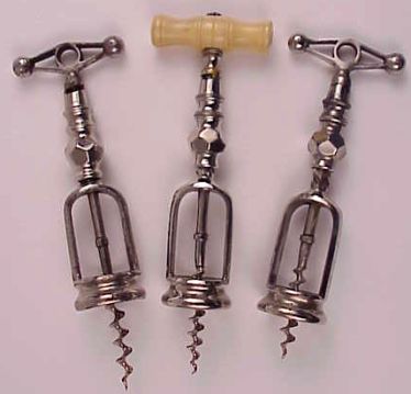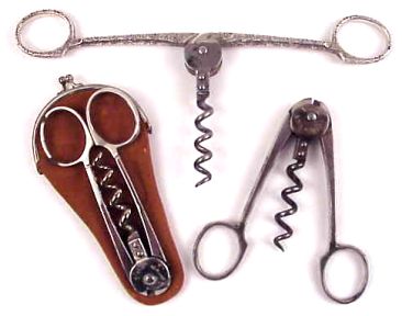 The example on the left in our photograph is marked G.M.S. No. 10985. The scissors corkscrew on the top has an ornate design on German silver handles. When not in use, the handles are folded with finger holes together protecting the worm.