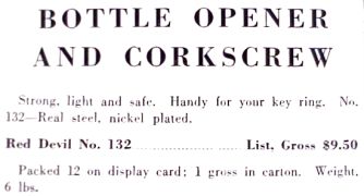 The 1934 catalog included a 1928 Harding Patent bottle opener and corkscrew.