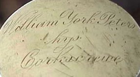 This stag handle corkscrew has sterling silver endcaps. The large cap is engraved "William York Peters hys Corkscrewe" (his corkscrew). The small cap is engraved "From his friend Charles F. Sprague".