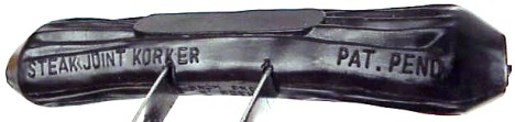 Wirtz, Virginia -We have long been intrigued by the "Pat. Pend." mark on this plastic handle prong puller from the Steak Joint. It also has "Made in Hong Kong" molded into the handle. That would lead one to believe that "Pat. Pend." refers to a Hong Kong patent. It came in a colorful box which has space for a name an address to mail it. Hey, you had a good meal there, why not buy a souvenir and mail it to a friend.
