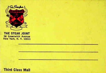 And on the box we learn that this is "Another Product from The Steak Joint in Greenwich Village, New York City." Were there other products? Yes, we know steaks. But perhaps t-shirts, mugs, hats, and more. How about a Doggie Bag? In Nation's Restaurant News we learn from Jane and Michael Stern: