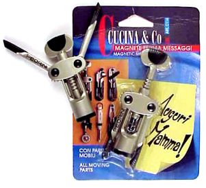 We went in search of corkscrew magnets and came up with those pictured in this gallery. The magnets above right look like the same producer with different packaging. They are 3 1/4" plastic double levers.