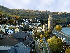 Left, with Rhine river view: Hotel "Goldener Propfenzieher" (Hotel "Golden Corkscrew"), Oberwesel / Rhine, Germany. Right: "Katzenturm" ("Cat tower") and "Ochsenturm" ("Ox tower") and the Rhine river. View from the "Steingassenturm" ("stone alley tower").