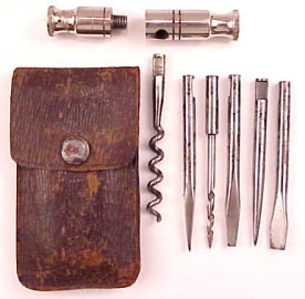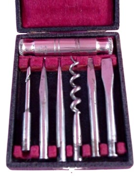Just got back from Brimfield and I found a few interesting corkscrews. One of the pieces I found appears to be an unknown German patented tool kit? I've attached several photos of it; it's a full size corkscrew (with two-part solid handle) with five other tools that fit neatly into a felt lined leather case. It's marked, I believe with the makers name (or abbreviation of something) OHEBA, D.R.G.M. Ron MacLean said he hasn't seen it before and it doesn't show up in any of the books on German patents. Ron suggested it might be worth putting it out on your website to see if anyone has more information on it.