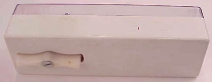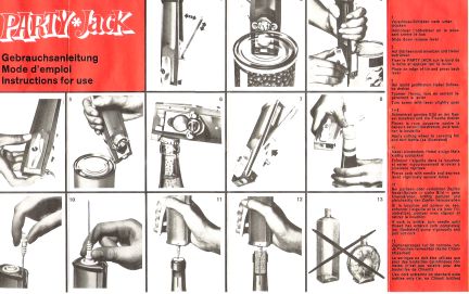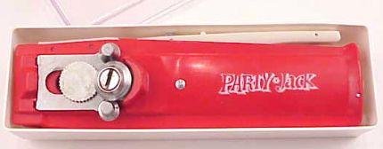 This example of the Party Jack packaging has a plastic case with a hole cut out in the bottom to accomodate the can opener handle. It almost seems like the box was made to small so the hole had to be cut to fit the piece in. The handle protruding out serves no purpose. Instructions do not have the colorful graphics used in the tube packaging: