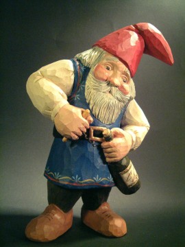 Inspired by a picture I saw while cruising through (I think) your website, I carved this gnome uncorking a bottle. He's not weather-proofed, so he doesn't go outside on the front porch, but rather sits on the shelf with the million other Santas I've carved (I typically do Santas). He's about 14" tall, and carved from a single piece of basswood. The corkscrew is from my collection: I sacrificed a mini for him to use. It was one of those folding minis; Listerine, I think. Just thought you wouldn't mind some benign email from an occasional collector.