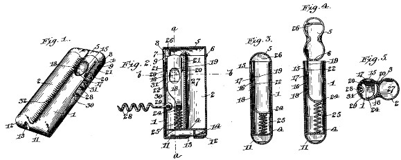 Charles L. Higgins of Springfield, Massachusetts applied for his "Match-Box" patent on April 17, 1895. U. S. Patent Number 553,030 was applied on January 14, 1896. In his application Higgins sums up his invention with the claim "A compound pocket implement comprising a match-box made of two tubes longitudinally secured together and provided with a top and bottom, a cigar-cutter in one of said tubes, a cork-screw foldable into the same tube and a call-whistle upon one end of the device."