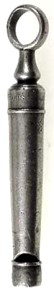 Below left: SCReWbase notes that these whistles with carriage key often have an "indistinct diamond registration mark on the head ring". The mark is Joseph and James Hudson's (Birmingham) British Registration 298,209 of February 7, 1876. Compare the locking mechanism and collar to the example shown in January 10 issue (center). A third variation (right) was submitted by Leonard & Debbie McDowell. Note the difference in the corkscrew mount as well as the decoration at the top of the sheath.