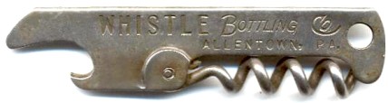 A whistle corkscrew? Well it doesn't have a whistle but it says "Whistle". It's a Nifty corkscrew with advertising for Whistle Bottling Co., Allentown, Pennsylvania (from the collection of John Stanley).