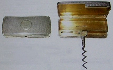 A silver match box with gilded interior houses a sliding corkscrew. (Courtesy of Ferd Peters and Bert Giulian, authors of History of Pocket Corkscrews and Pocketknives.
