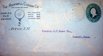 In the February 4, 2007 edition of The Weekly Screw, we featured the above envelope (found by reader Mark Woodard) together with a number of Ayer's trade cards. Reader Josef L'Africain found a later Clough envelope. This one was mailed in 1916 to the Bergen Pharmacal Co. in Rutherford, New Jersey.