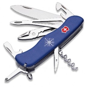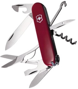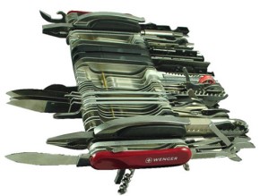 This is an eighty-five tool Swiss Army knife, including golf shoe spike wrench, a bike chain rivet setter, laser pointer with a 300 foot range and a corkscrew. The knife is made by Wenger in Basel, Switzerland and has a retail price of $1200.