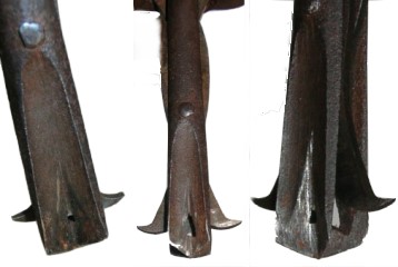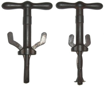 This tool appeared in the 2006 auction of the Alf Erickson corkscrew collection. It was listed as a "Whatsit". Some thought it might be some sort of crude cork remover where the sharp teeth are forced through the cork and then the prongs are engaged with the bottom of the cork for lifting. It sounded like a remote possibility yet requiring such force to get the teeth through the cork that it might first push the cork into the bottle.