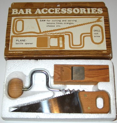 The drill corkscrew in this carpenter's set is accompanied by a plane bottle opener, and a saw for cutting fruit, cheese, etc. The set is wood and stainless steel and was made in Japan.