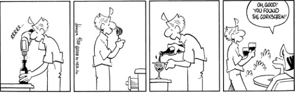 Last we read a story entitled "How NOT to open a bottle of wine". Dave wrote " I fetched my Dewalt cordless drill from the basement. My associate Jim steadied the bottle on the kitchen island. I placed the drill bit on the cork, and methodically proceeded to burrow through the reluctant cork to the burgundy nectar within. We eagerly watched the bit of the drill go deeper and deeper into the cork and then BAM! The built-up fermented gases in the bottle exploded out, coating our faces hair and clothes with a glistening coat of red wine. My friends and I were nearly hysterical with laughter. Until we looked up at the ceiling. Directly above the island was a handsome, shotgun blast-shaped spray of dark red wine on my flat white kitchen ceiling. A glorious stain. "