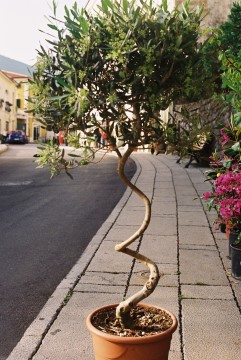 Marcello Rossani writes "I send you the picture of this blossomed 'corkscrew olive-tree' (artificially created). I saw in a street of Maratea, Italy.