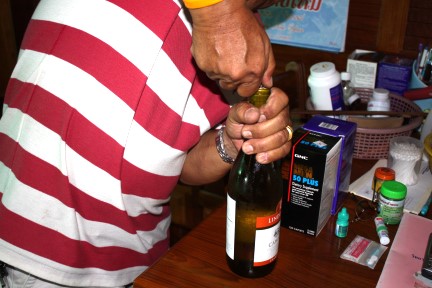 Do you remember all of those stories we had in the past about removing a cork without a corkscrew?* This past Wednesday Alf Erickson and his wife Watcharee visited her family north of Bangkok today. Alf wrote "I brought a couple bottles of wine....but, I forgot the corkscrew. Her uncle came to the rescue with a special corkscrew." Proof that there can be life without a corkscrew!
