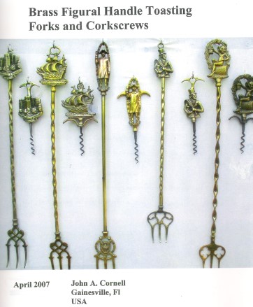 Gainesville, Florida - In the June 4, 2006 edition of The Weekly Screw we published a brief introduction to the "Brassies" of John Cornell. Now John has published his comprehensive study Brass Figural Handle Toasting Forks and Corkscrews. This 140 page scholarly work includes a huge number of photographs of the forks and corkscrews. Regarding the forks, John writes "On display in this monograph are approximately 485 different handles along with 4 types of shafts and approximately 45 different shapes of tines."