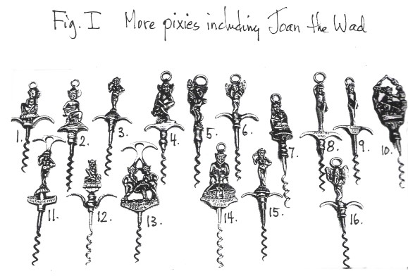Over 350 corkscrews are pictured including fifty different cathedrals, abbeys, minsters, churches and castles, twenty-three ships, galleons and sailboats, thirty-three dogs and cats, twenty-eight pixies and many, many more. There are also "pairs" of toasting forks and corkscrews with matching handles. Some of the corkscrews have a two-finger pull piece between the handle and the shank and there are a variety of screws - helical, ciphered, and bladed.