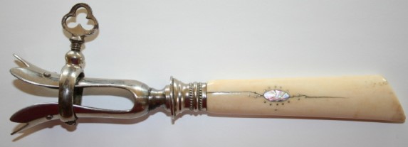 Reader Al Haché writes "I have had one of these holders for a number of years and The Weekly Screw (April 29 2007) has set me straight. I was told it to be a ham bone holder, but the holder seemed to be too small for ham. A mutton bone holder makes more sense. This one has an ivory handle which is held to the holder by a screw. it also has a mother of pearl indentation in the handle. No markings. It appears that the "Vintage Champagne Wine Key Opener" pictured in The Weekly Screw is the bone holder without the handle."