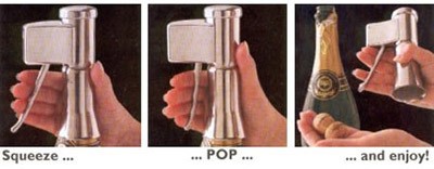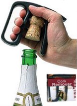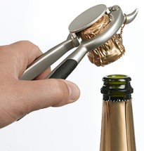 "Champagne Cork Extractor. Twist like a professional! This sturdy cork extractor really is the business. The strong metal jaws get to grips with the cork and hold it firmly under control as you steadily twist the bottle away underneath."
