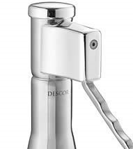 The "Descorjet Champagne Opener, serve para controlar o saca-rolha e a quantidade de bebida que irá ser desperdiçada, a champagne pode ser aberta facilmente e com segurança, já que funciona tipo como uma alavanca. O saca-rolha é mantido dentro do Descrojet Champagne Opener ao invés de sair voando pelos ares." When taking the wire off the bottle you can place the Champagne Opener just above the cork with one hand. Use the other hand to undo the wire. If the cork comes out because of excess pressure it will go into the Champagne Opener.