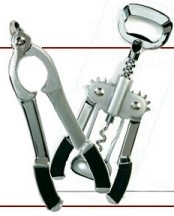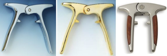 From Franmara: Chrome and gold plated Champagne openers described as "Strong piano-type double hinge that's spring loaded makes it easy to remove the cork." Franmara also offers one from Laguiole with "Wood inlaid handles. Capture the cork first then twist or break the wire muzzle. Twist the cork from the bottle. Safe. Spring loaded action."