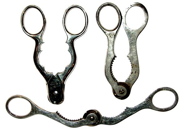 The top and left grippers with wire cutters resemble Bay's patent and are marked DEPOSE PARIS J B. The gripper at bottom right in the above photo was made by Ed Wüsthof in Solingen, Germany and has his mark.