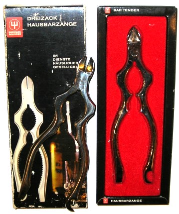 A cork grip marked DREIZACK SOLINGEN D.B.G.M. Ed Wüsthof obtained German Patent No. 1,772,398 on August 14, 1958 for his Barzange. The many uses of the "Trident Bar Tender" are "Cuts wire (Champagne bottles), Sturdy screwdriver, box top lift, Cracks nuts, eases out Champagne corks, Opens screw top jars, Small tack hammer, Breaks ice cubes, Cap lift, can punch, Squeezes limes, lemons." It is the "Maid-of-all-work".