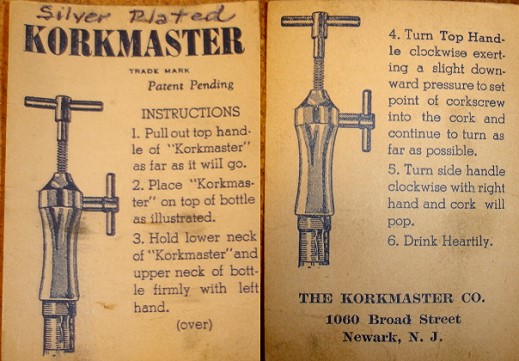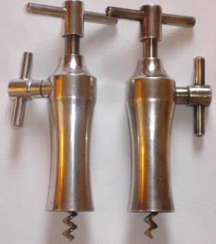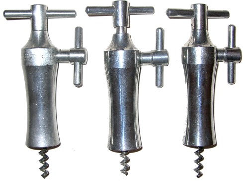 Here are three variations of McDowell's 1948 Korkmaster design patent. On the left is a brushed aluminum version which weighs 6.0 ounces (170 g). In the center is a polished aluminum version which weighs 6.2 ounces (176 g). The one on the right is a chrome plated aluminum version which weighs 7.4 ounces (210 g).
