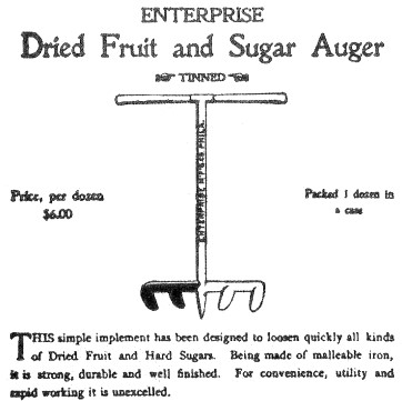 Patent number 252,738 was issued on January 24, 1882 to Ernest P. Chesbro of Willimantic, CT for his device for breaking up sugar, salt, etc. It is pressed into the food while twisting, breaking it up so that it can be removed. Although his device has four arms of teeth and the teeth point straight down, it is quite similar to the two-armed ENTERPRISE Dried Fruit and Sugar Auger that has its teeth at an angle. The ENTERPRISE auger was advertised in the 1899 catalog of The Enterprise Manufacturing Company of Philadelphia, PA. That advertisement is illustrated below, and the auger in the illustration is marked ENTERPRISE M'F'G CO PHILA.