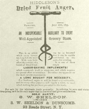 Patent number 166,171 was issued on July 27, 1875 to Henry J. White of Green Bay, Wisconsin. He has a central guide-rod and one or more spiral prongs. His handle may be either wooden or metallic. His drawing illustrates a twisted guide-rod but the patent description is silent on that matter. White assigned his patent to James V. Hiddleson of Chicago, Illinois. An advertisement in The American Grocer, November 10, 1881 illustrated White's lifter with the correct patent date and labeled as HIDDLESON's DRIED FRUIT AUGER. Its guide-rod is straight, and S. W. Sheldon of 93 Reade Street, NY is listed as the sole agent for it. So apparently White sold the patent to Hiddleson who manufactured it and contracted Sheldon to market it.