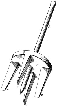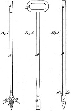Next was patent number 172,278 issued on January 18, 1876 to Henry F. Patton of Appleton, Wisconsin. He assigned one-half to Albert S. Dean of Eau Claire, Wisconsin. His design consists of a pointed guide-rod that supports a bracket. Pivoted to the bracket is a two-pronged curved claw. The claw is placed in alignment with the guide-rod and the ensemble is pushed into the fruit near the edge of the barrel. The claw handle is then raised, swinging the claw through the fruit and loosening it.