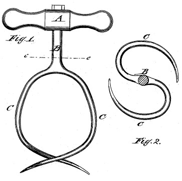 Patent number 352,736 was issued on November 16, 1886 to John E. Coles of New York City. Coles refers to a previous patent of similar design but doesn't name it. Probably he is referring to White's patent. However, Coles' design is slightly different, having a larger diameter of twist for two or more turns in the center guide-rod and forming blades at the tips of the two coiled arms. He also places the tip of one arm lower than the other so that it engages the fruit first. Each arm then "shaves" layers off the fruit or sugar, much like a double-bladed twist auger cuts a hole in wood.