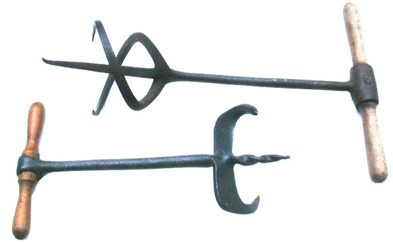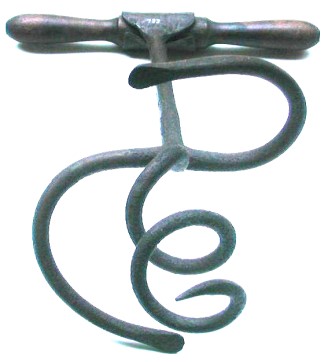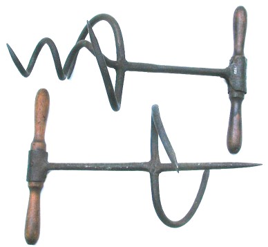 What you never saw in any "Western" movie was how the grocer got the tightly-packed contents out of the barrel. What he did was pick up his trusty fruit auger, turn it into the center of the mass a little way, and pull it out - just like pulling a cork out of a bottle with a corkscrew. In fact, most of these implements resemble cork pullers but are somewhat larger. With a small core removed, the sides of the hole could be loosened by pushing them into the space vacated by the core. Other designs just loosened the contents without pulling a core out.