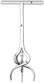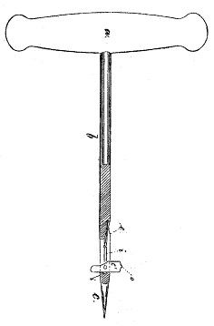 Patent number 144,542 was issued on November 11, 1873 to Harry W. Holman of Waterloo, Iowa for a lifter without a helix. He has a spear with pivoted wings at the tip. When pushed into the barrel the wings fold into the body of the spear, but when it is pulled up the wings pivot out, grabbing and loosening the contents. Notice the similarity of Holman's design to that of the cork pullers of Alexander (1860), Wyckoff (1861), and Williamson (1868) shown at the end of this article.