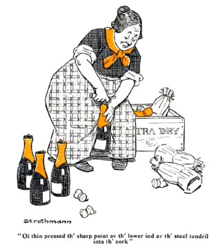 Onta th' upper ind av this, an' crossways, 'twas no thrick at all t' fix a clothespin. Oi thin pressed th' sharp point av th' lower ind av th' steel tendril inta th' cork av wan of th' champagne bottles, an' twisted th' tendril around. Thin, by pullin' sharp upward on th' clothespin, an' at th' same time houldin' th' bottle toight betwane me knees -- which Oi had covered wid rosin to prevint th' bottle slippin' -- Oi drew out th' cork.