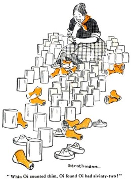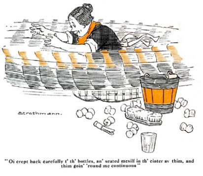 Thim bottles was now all impty, an' Oi steadied th' house wid wan hand an' counted th' bottles wid th' other. There was twinty-siven left out av th' dozen! Thin Oi got me scrubbin' brush an' a pail av wather t' clane th' bottles, but t' me surprise Oi found Oi cu'd not git th' brush inta th' neck av th' bottles. Oi therefore turned th' twinty-siven bottles wrong side out, an' scrubbed thim well, an' turned thim roight side out agin.
