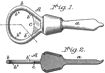 Note that the cap in Figure 4 also contains a loop, and the drawing also shows a hooked tool for lifting it. On February 6, 1894 Painter received patent number 514,200 for a tool to lift his crimped crown caps, and on the opposite end was his hook for lifting those containing a loop. That patent is shown in Figure 5.