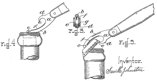 There were several patents for crown cap lifters before Johnston's. For example, Painter himself had the one in Figure 5, and both Walker and Williamson of corkscrew fame had their cap lifter patents. But none of the earlier patents used a thin hooked blade to do the lifting. Johnston was the first to do that, and he also included an end hook for lifting stoppers with loops. He also sharpened the inside edge of the longer hooked arm so that it could be used to cut the wires that were often used to hold a cork in place. This wire cutting function was not incorporated in the All-Ways. Johnston's patent drawing shows his blade incorporated into a jack knife, an application that was popular for many years.