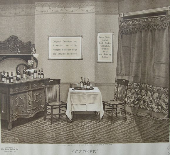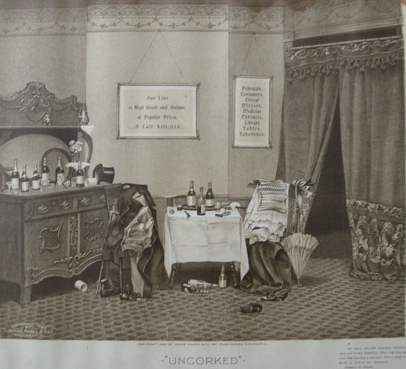 This Corked - Uncorked print is an exhibit at the Furniture Exhibition Building (location not indicated). It is a 1894 print copyrighted by Oscar Onken & Co., Art Publishers, Cincinnati, Ohio. There is a corkscrew on the table.