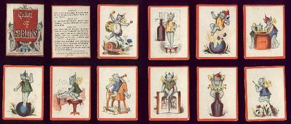 Last week a partial deck of cards called the Game of Goblins was offered for sale on eBay. The cards were published by L. Prang & Co., 159 Washington Street, Boston, Massachusetts. The seller dated the deck at c.1865. A goblin is pulling a cork from a bottle in the card second from bottom right.