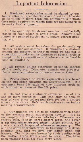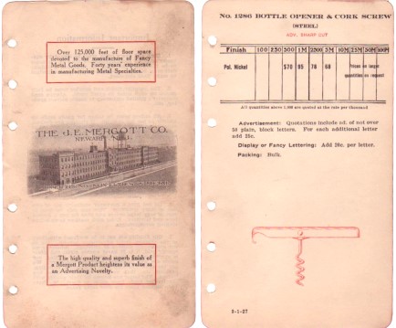 Reader Andy Denes wrote: "I recently stumbled across a 1929 salesman's price list for the J. E. Mergott Company, also known as Jemco. It shows their novelty product line of some 41 different products consisted mostly of desk items, but it included several matchbook and matchbox items. It also included the attached page showing their corkscrew. That page is dated 3-1-27, but the little loose-leaf notebook contained other items dated into 1929. I also am attaching the title page and "Important Information" page, which consists of instructions to the salesman."