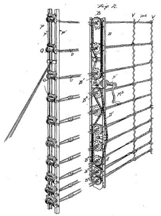 "Finally, I did a Google search on 'Fence Weaving Machine' and nearly all of them show the pickets made of wooden slats, woven together with vertical strands of wire. A few show the use of only wire, but woven in a diagonal latticework pattern. Then, I found patent # 518,506 issued April 17, 1894 to John Lane and Cornelius Lane of Holly Michigan. It also shows corkscrew shaped wire pickets."
